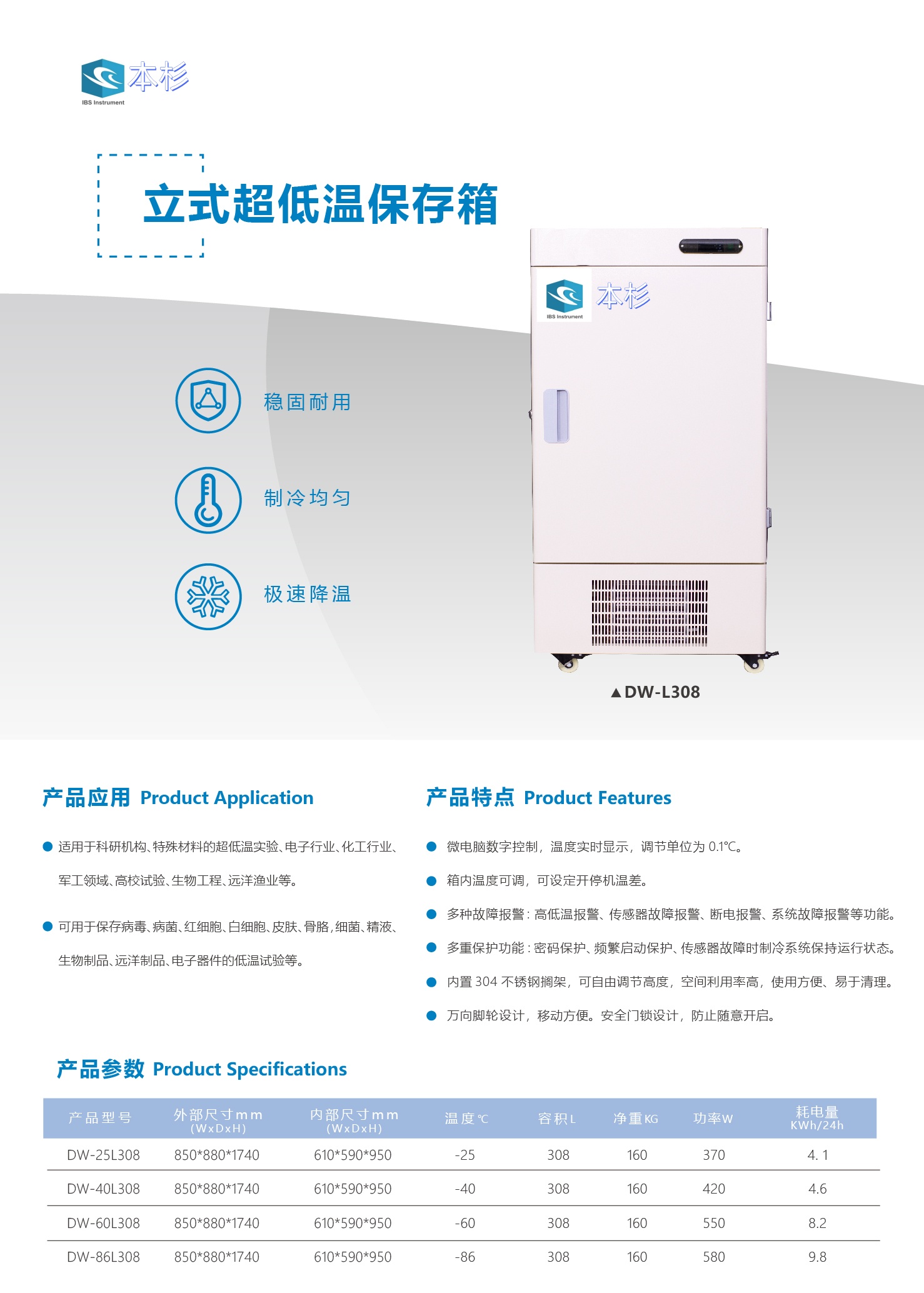 立式超低温保存箱DW-L308制冷均匀 急速降温移动 方便安