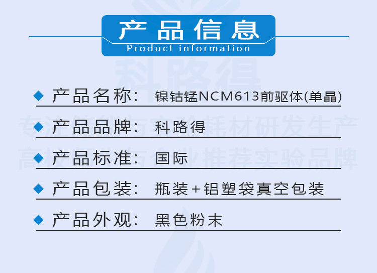 镍钴锰NCM613前驱体(单晶)科路得能源三元锂离子电池正极科研材料