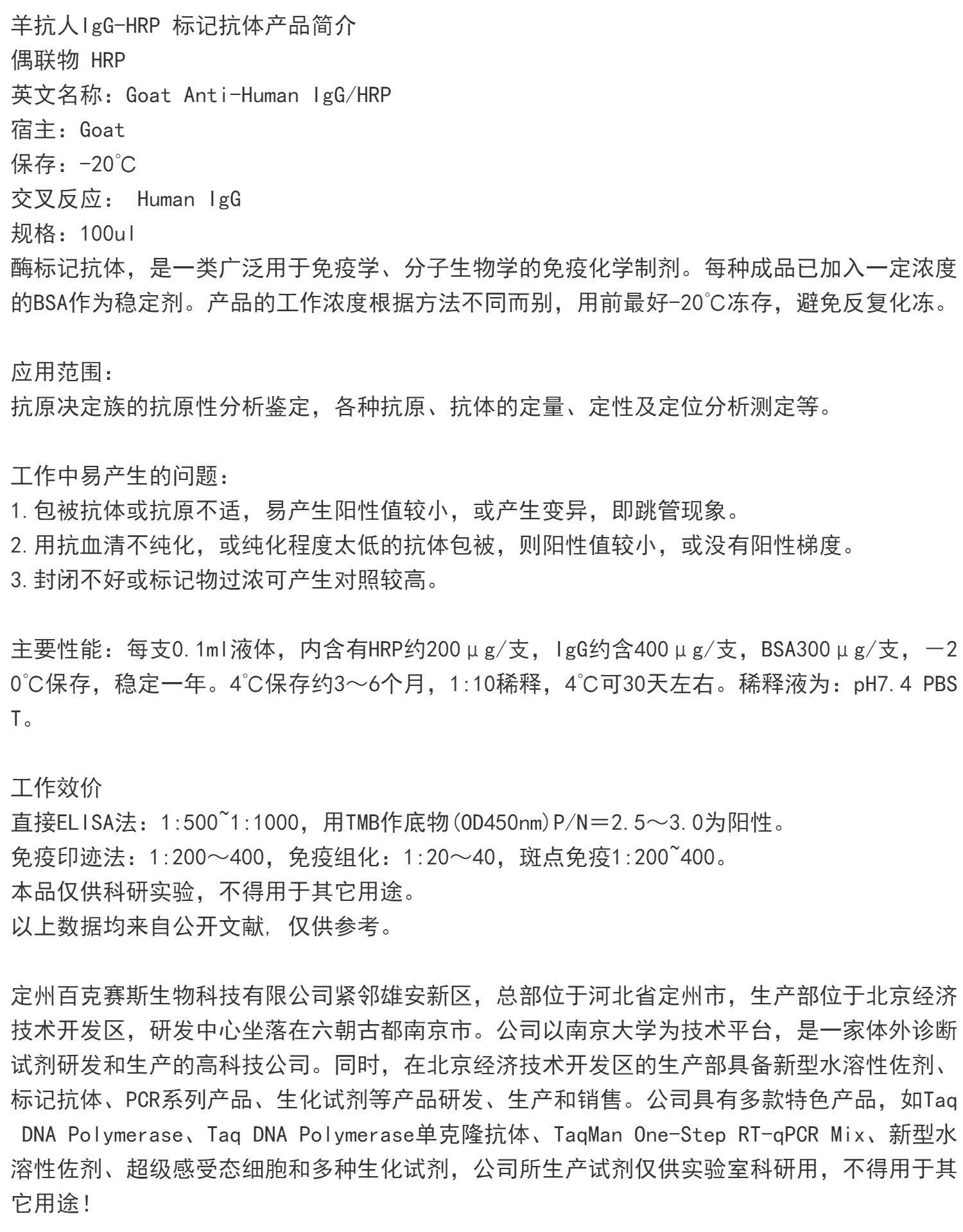 羊抗人IgG-HRP标记抗体 实验用标记抗体 百克赛斯生物