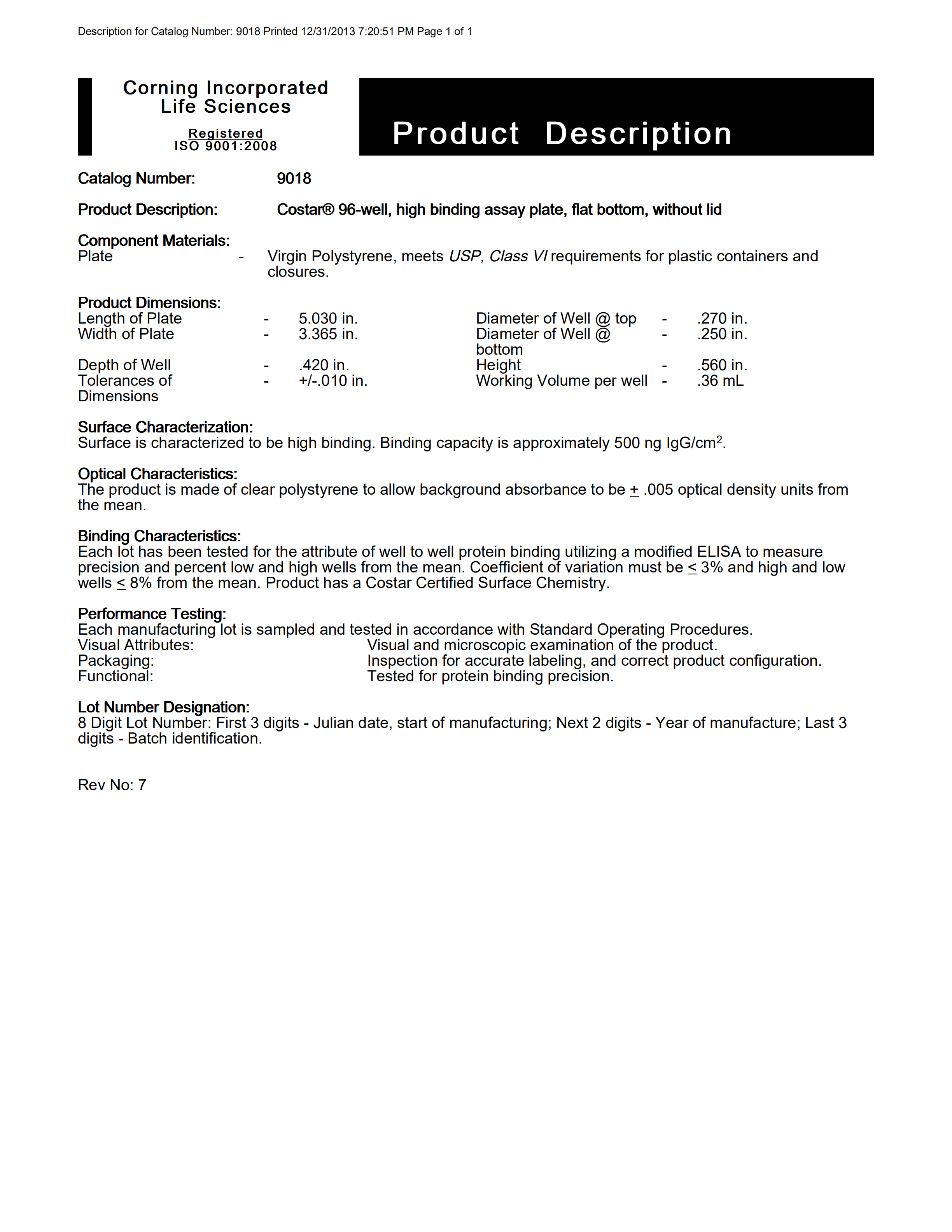 康宁Corning 9018 96孔透明平底聚苯乙烯高粘结无盖微孔板 非无菌
