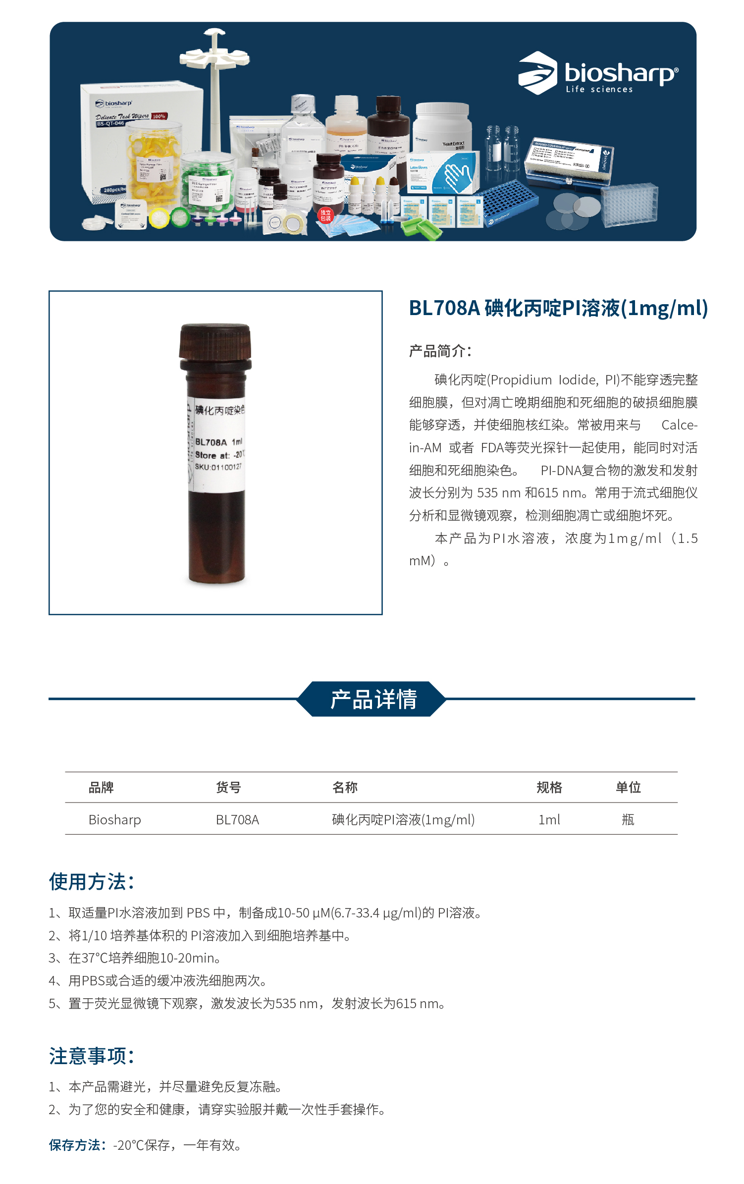白鲨Biosharp BL708A 碘化丙啶PI溶液(1mg/ml) 为PI水溶液 1.5 mM