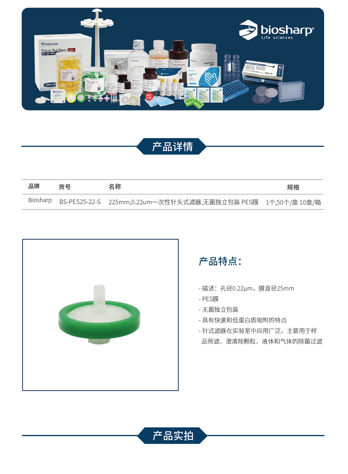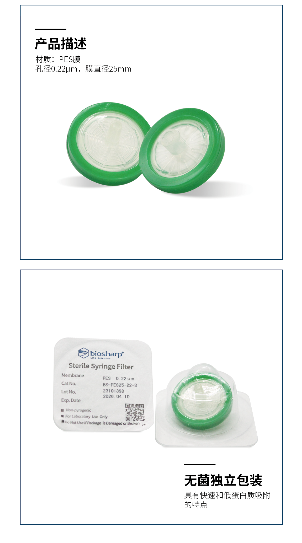 Biosharp BS-PES25-22-S 25mm,0.22u一次性针头式滤器无菌 PES膜