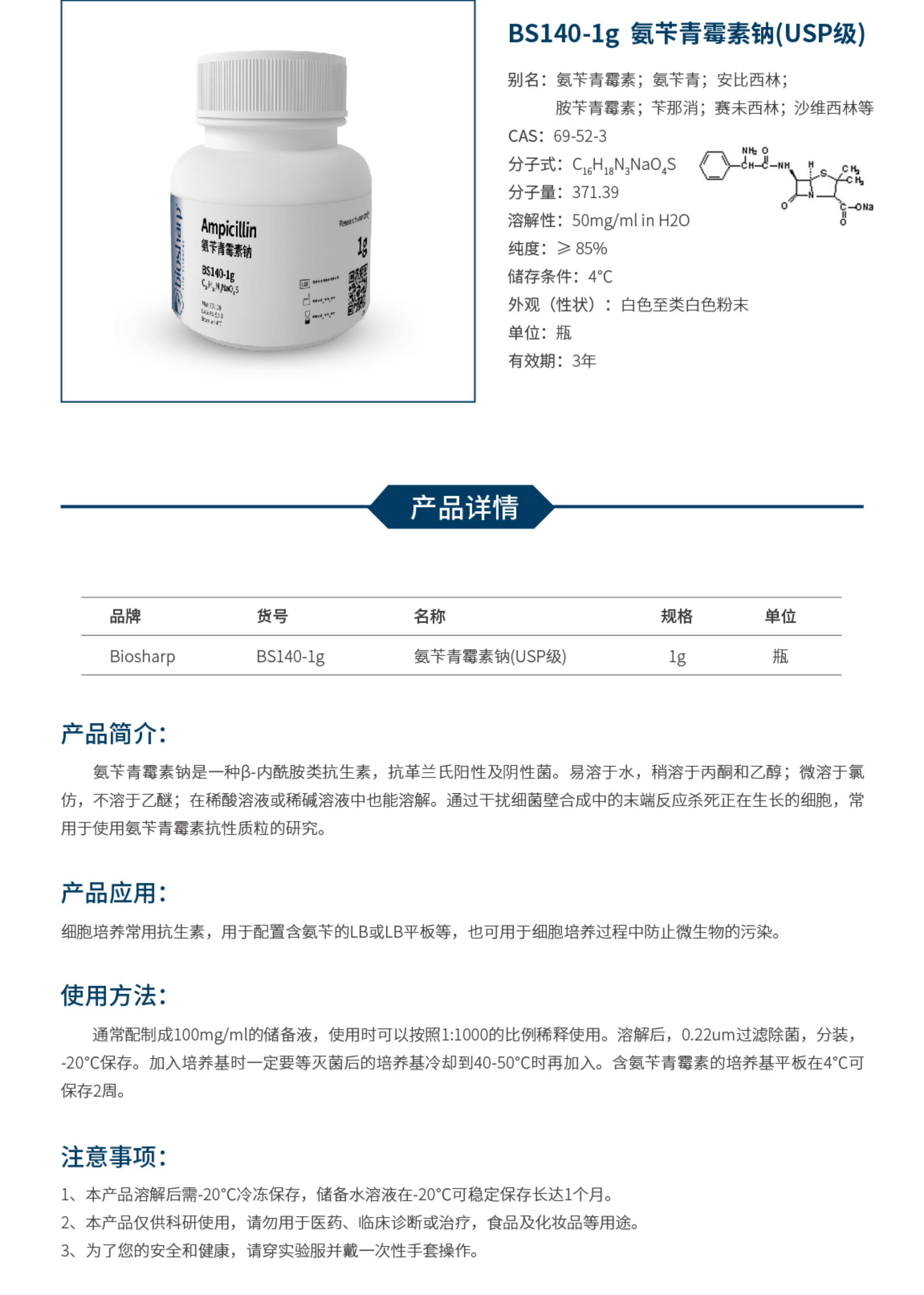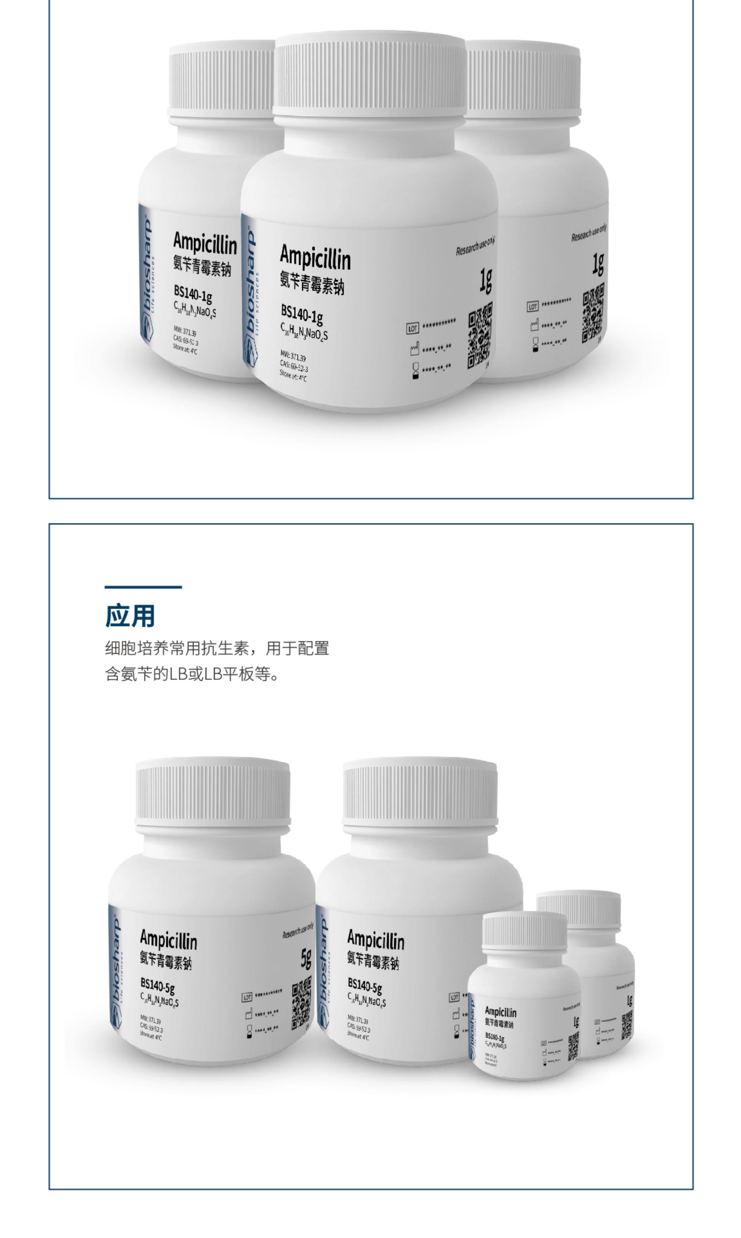 白鲨 Biosharp BS140-1g BS140-5g 氨苄青霉素钠 USP级Ampicillin