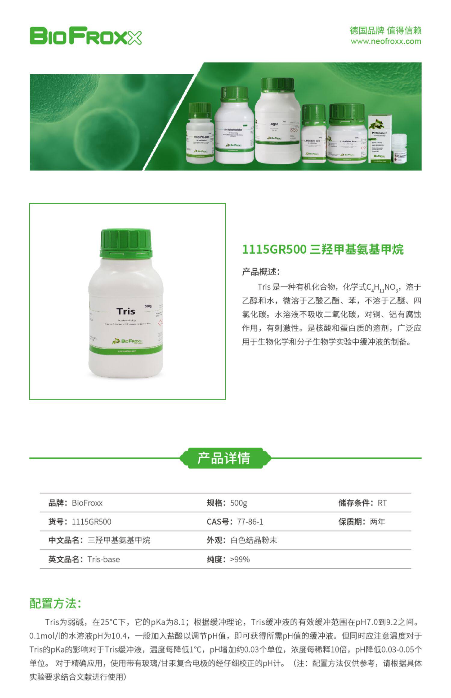德国BioFroxx 1115GR500 1115KG001 三羟甲基氨基甲烷 Tris-base