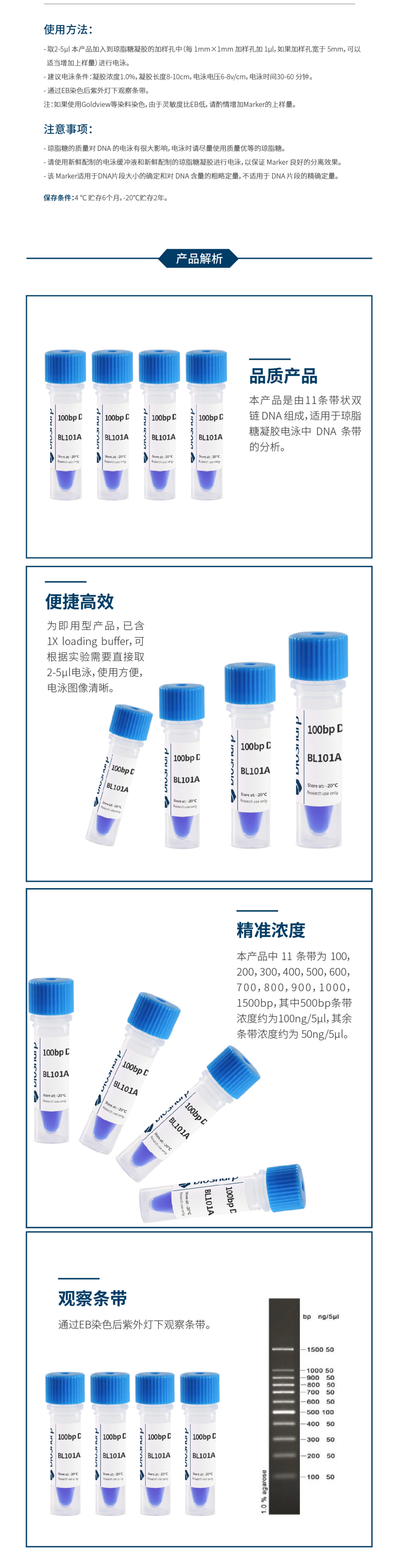 白鲨Biosharp BL101A 100bp DNA Marker 分子量标准(100-1500bp)