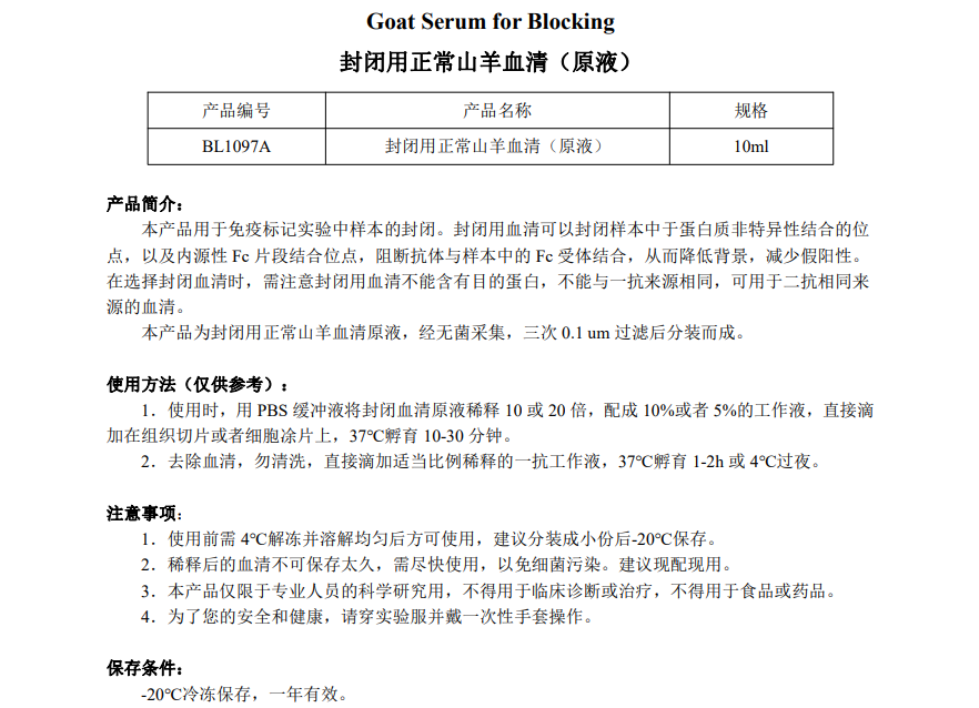 白鲨 Biosharp BL1097A 封闭用正常山羊血清(原液)