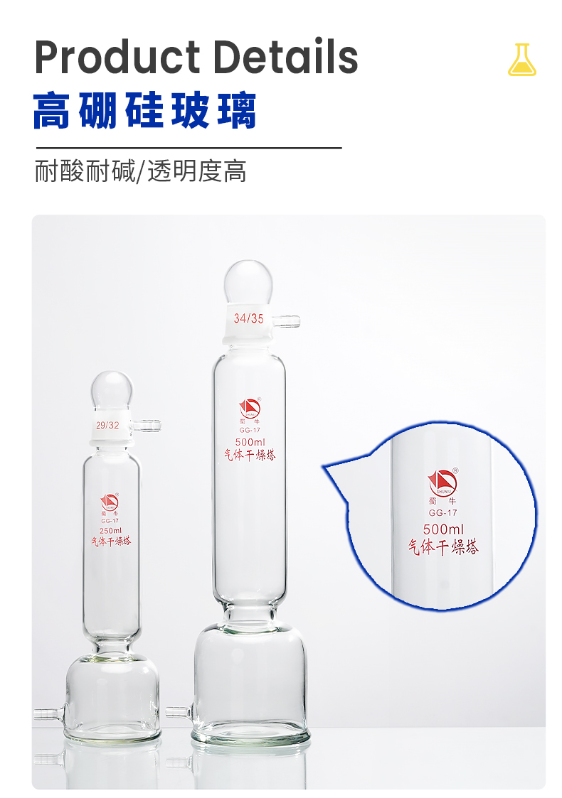 蜀牛气体干燥塔 250/500ml 固体吸收剂干燥吸收器 实验室化学试验仪器 加厚料透明玻璃厚壁缓冲瓶