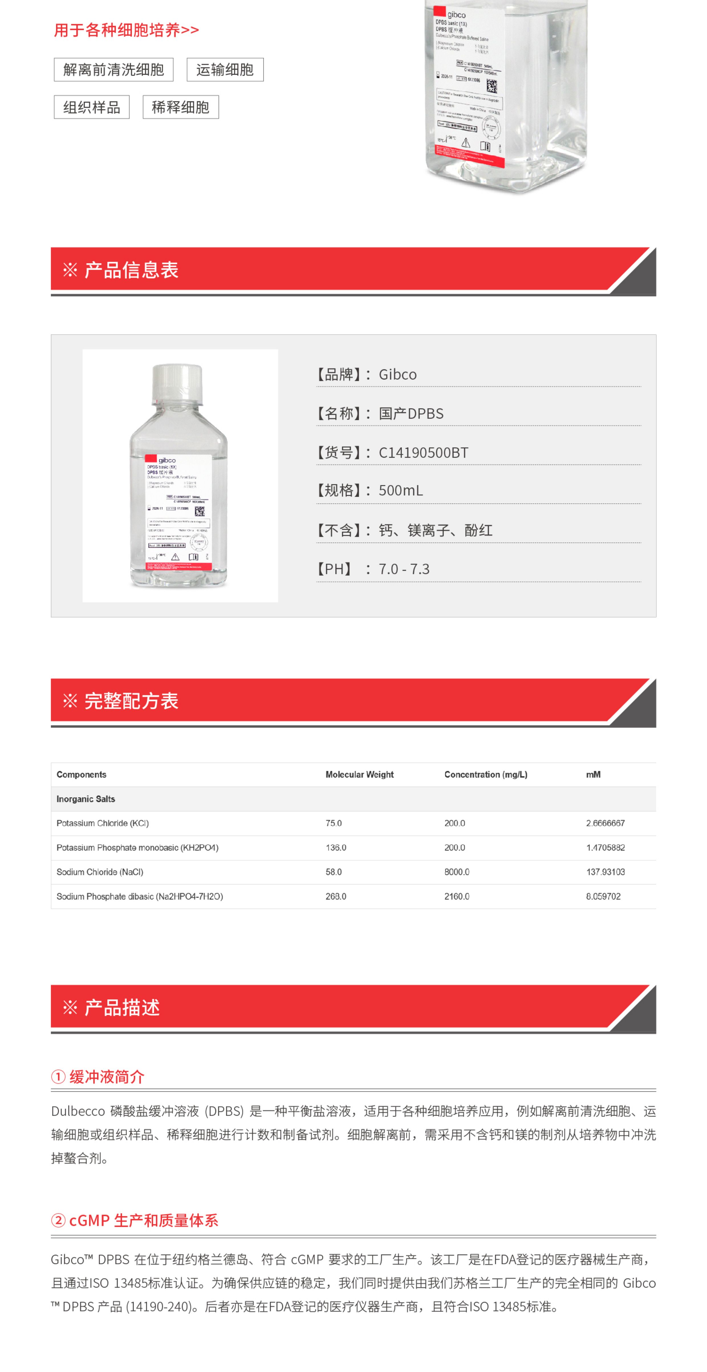 Gibco C14190500BT 国产DPBS缓冲液(不含钙镁不含酚红)