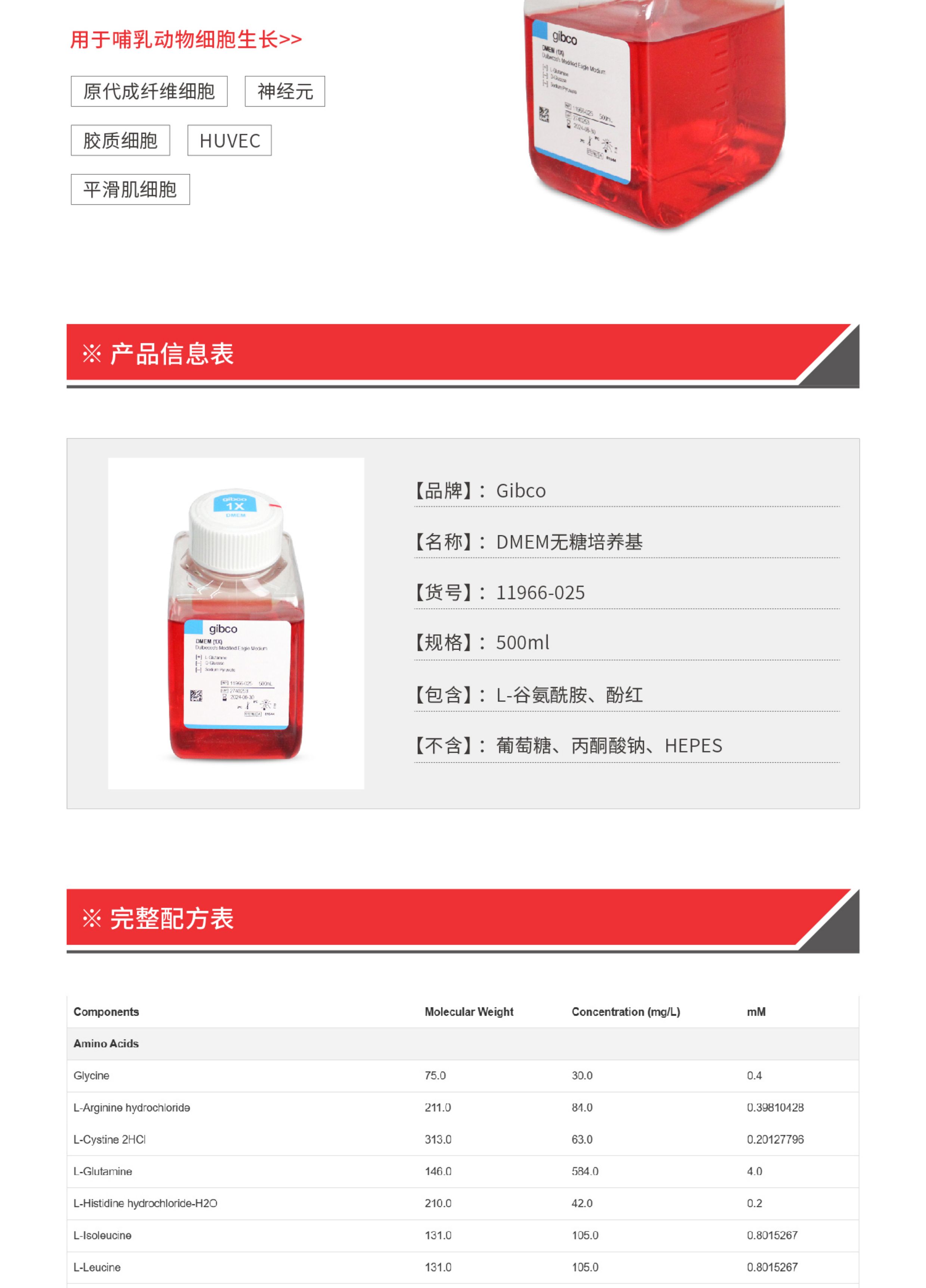 Gibco 11966-025 DMEM无糖培养基 含L-谷氨酰胺不含丙酮酸钠HEPES