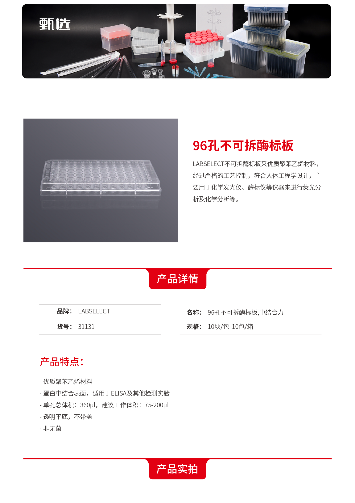 LABSELECT(甄选) 31131 96孔不可拆酶标板中结合力透明平底不带盖