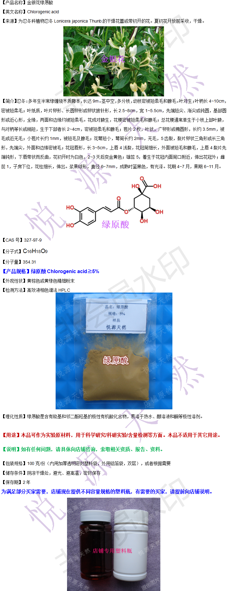 金银花5% 绿原酸 Chlorogenic?acid 实验科研用 100g 赠瓶子勺