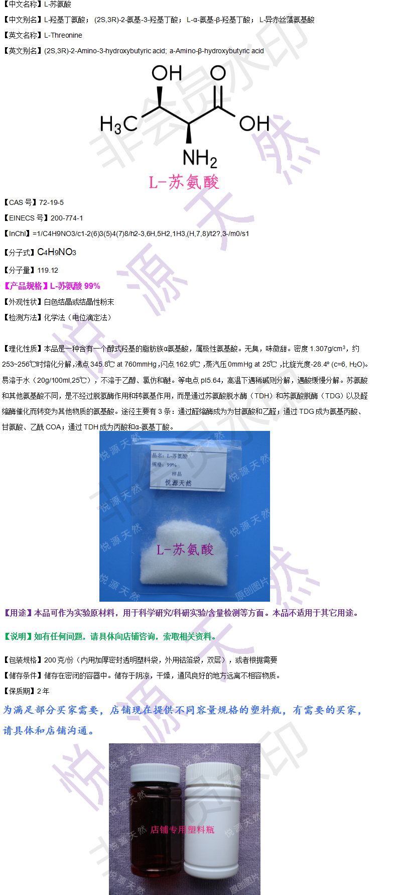 99%L-苏氨酸 L-Threonine 羟基丁氨酸 实验科研检测 200g 赠瓶子