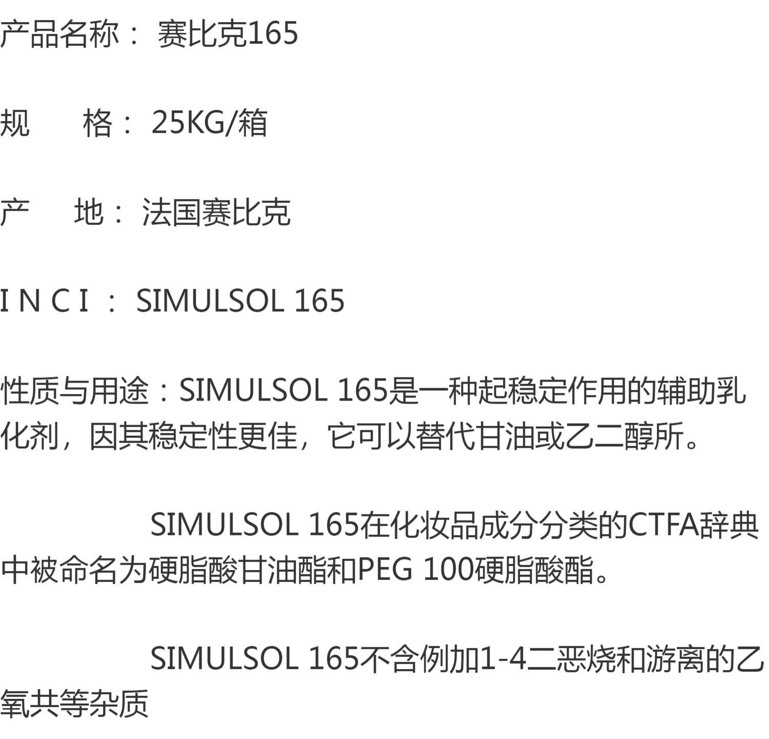 法国赛比克 SIMULSOL 165 硬脂酸甘油酯 非离子自乳化蜡乳化剂1KG