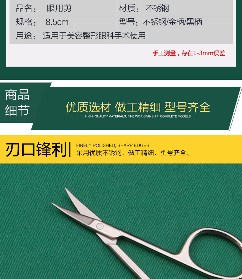 8.5cm不锈钢眼科剪双眼皮手术开眼角工具美容整形特快剪精细剪刀
