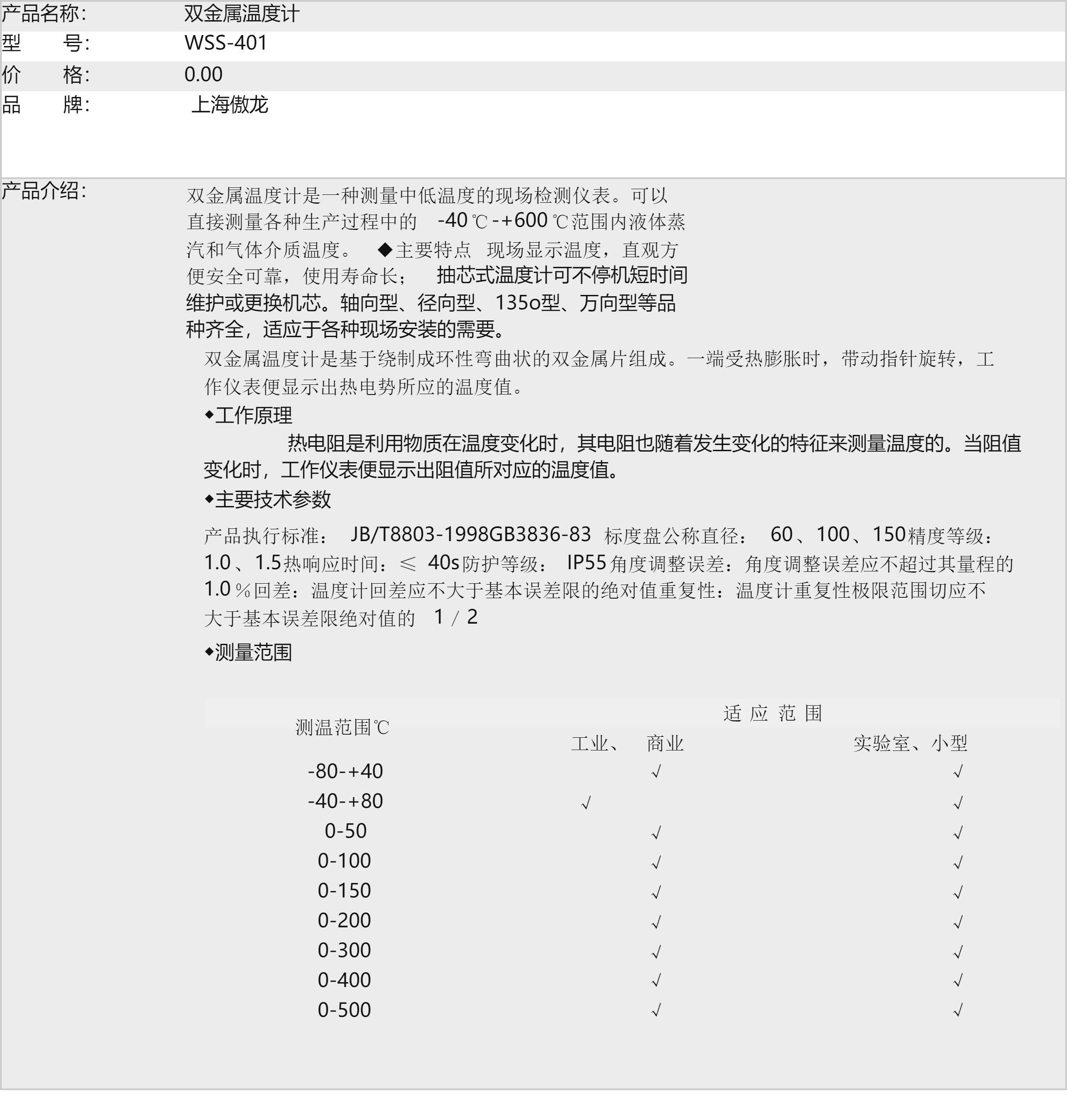 特价处理双金属温度计WSS-401双金属温度表工业温度计 轴向