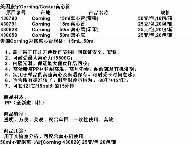 康宁Corning 50ml不带架离心管 430829 25支/包 20包/箱