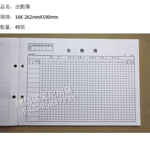 考勤簿 考勤本 考勤表 出勤表 出勤簿 16K 262*190mm 35页