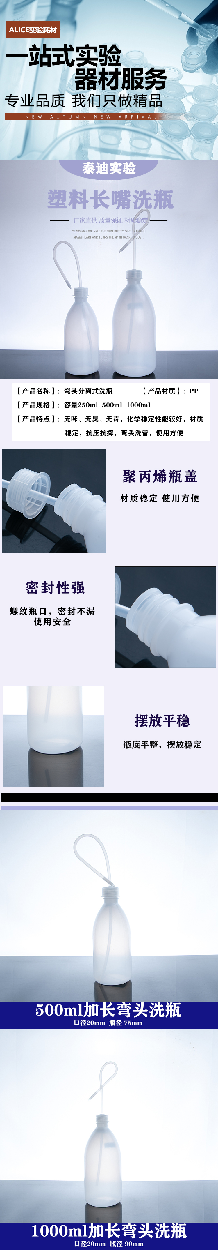 塑料洗瓶250 500 1000ml加长弯头安全加厚经济带长分液管专业实验室化学溶剂酒精瓶清洗壶工业挤压湾管冲洗瓶