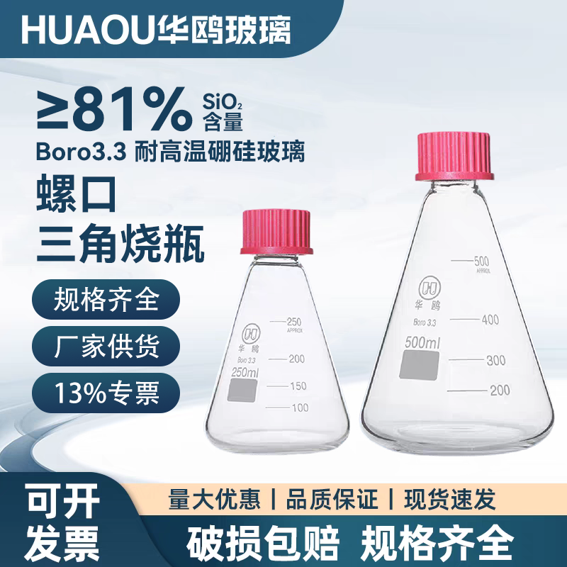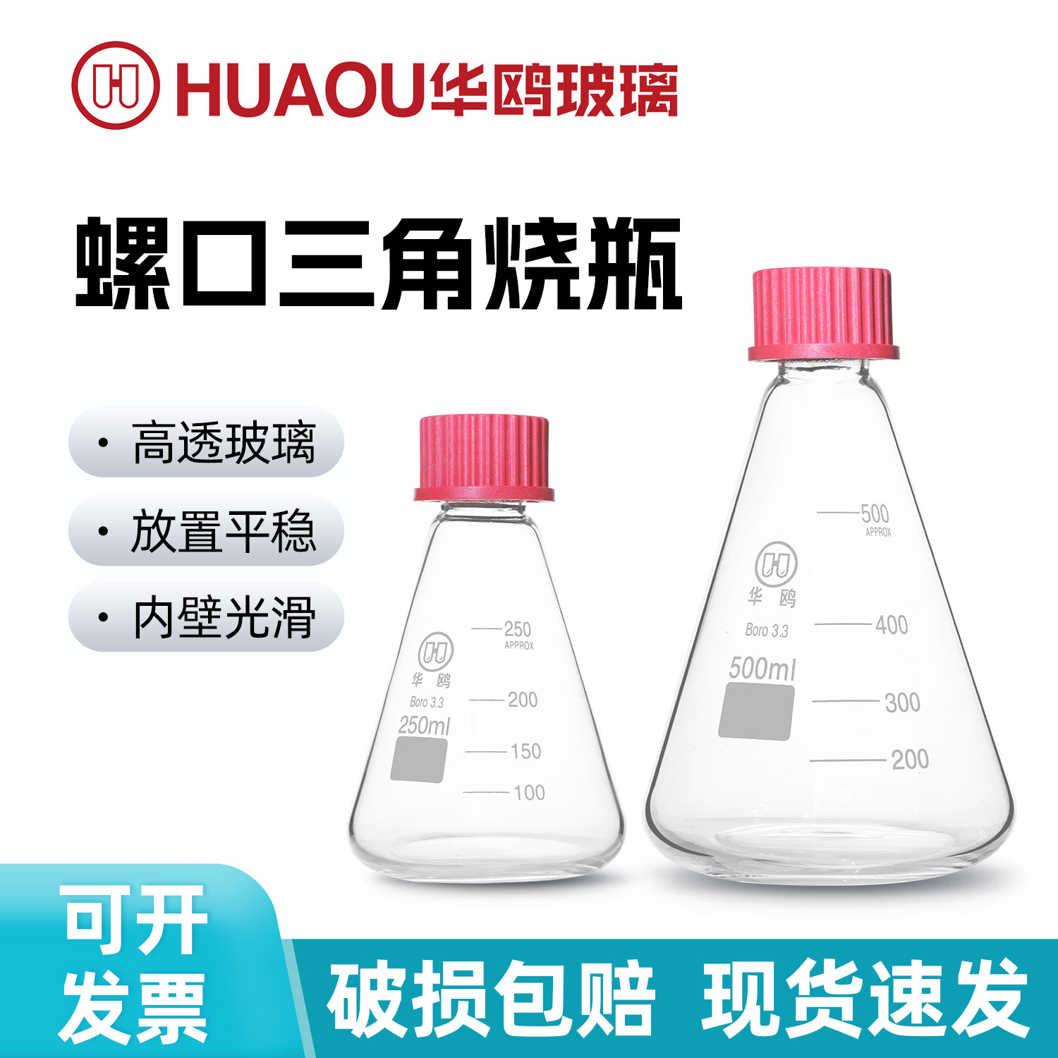 华鸥螺口三角烧瓶耐高温玻璃三角瓶锥形瓶带瓶盖震荡培养瓶试剂瓶